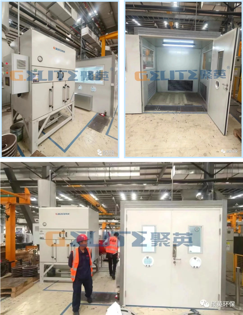 根據業主的要求需創建智能化、綠色環保車間,對工件的自動化打磨工作房進行負壓運行,同時打磨房內的粉塵經密閉抽吸收集后,通過管道進入高效粉塵凈化裝置,納米級金屬粉塵經除塵裝置處理后排入管道煙囪。經處理后的粉塵顆粒污染物排放指標需滿足環保要求,同時也達到職業衛生排放標準。
