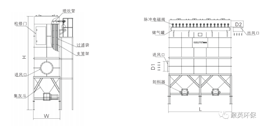 含塵氣體進(jìn)入脈沖袋式除塵器,氣流流經(jīng)灰斗,流速放慢,慣性作用使粗顆粒粉塵直接落入灰斗。起預(yù)收塵的作用,氣流隨后通過內(nèi)部裝有金屬骨架的濾袋,粉塵被捕集在濾袋表面,凈化后氣體匯集到出風(fēng)口排出,除塵器運(yùn)行過程中,積附在濾袋上的粉塵越來越多,濾袋阻力增加,處理風(fēng)量逐漸減少,為正常工作,需對(duì)濾袋進(jìn)行清灰,由脈沖控制程序控制脈沖閥開啟,壓縮空氣由噴吹管各孔經(jīng)文氏管噴射到濾袋內(nèi),濾袋瞬間急劇膨脹,使積附在濾袋表面的粉塵脫落。清下粉塵落入灰斗,經(jīng)排灰系統(tǒng)排出機(jī)體。由此使積附在濾袋上的粉塵周期地脈沖噴吹清灰,使脈沖布袋除塵器始終保持高效運(yùn)行狀態(tài)。
